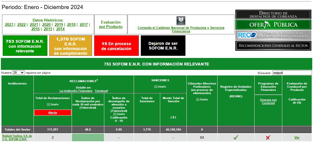 La información corresponde únicamente a REDPOLL TRADING S.A. DE C.V. SOFOM E.N.R. Para conocer la información de todo el sector de Sociedades Financieras y homologas, puede acceder al sitio https://www.buro.gob.mx/